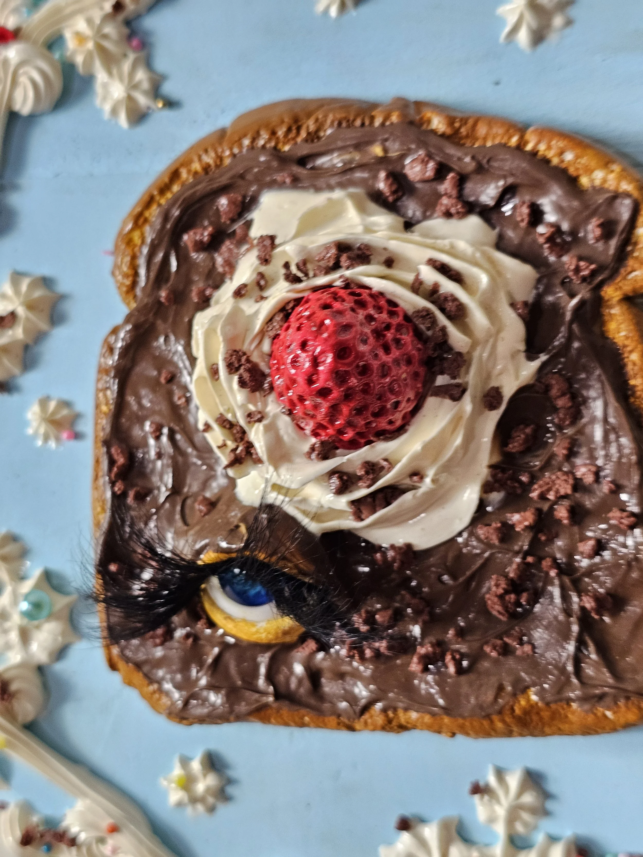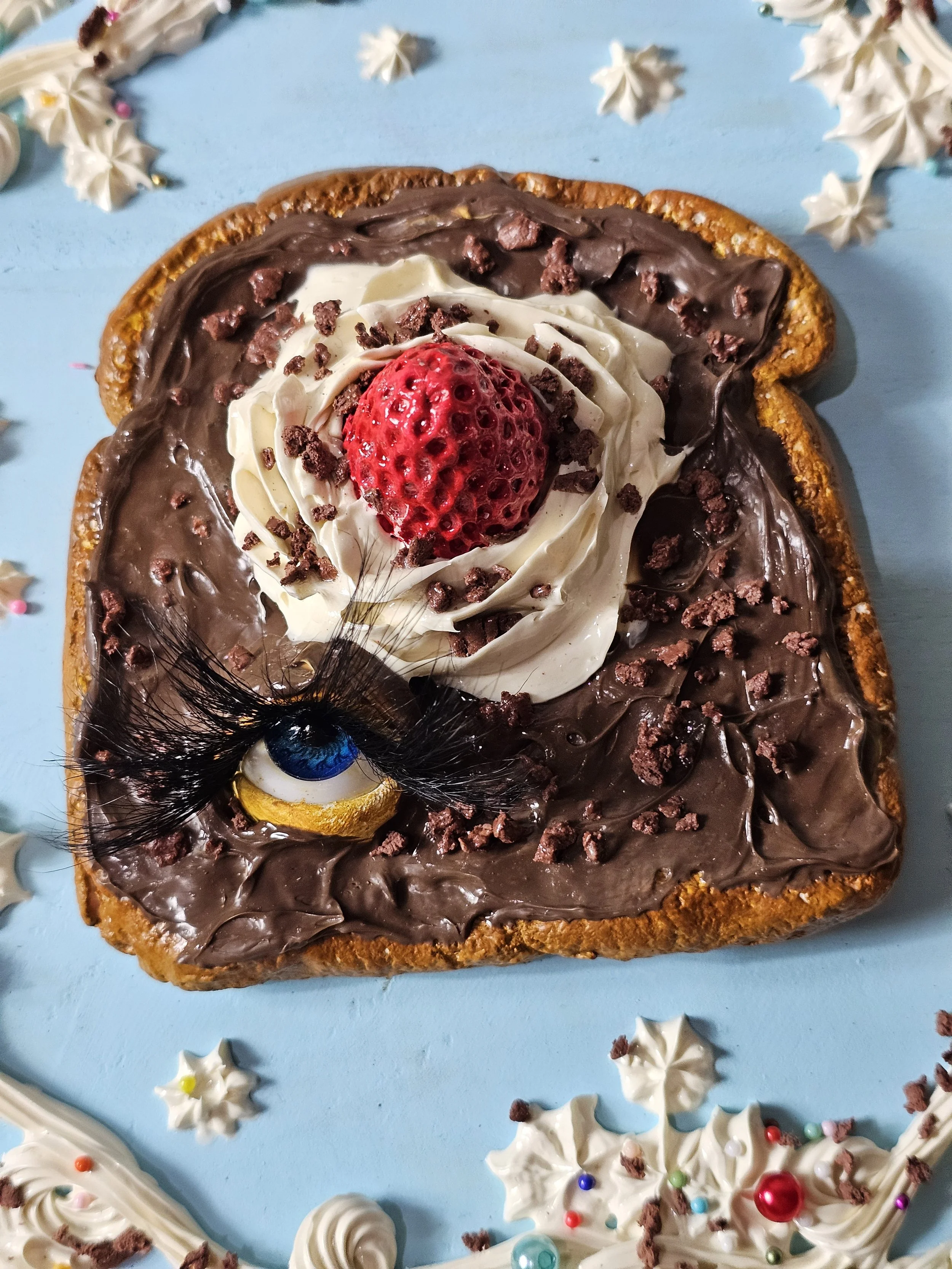 This delicious slice of toast spread with Nutella, and topped with whipped cream and a strawberry is sure to delight your walls. She might look sad, and its probably because she is!